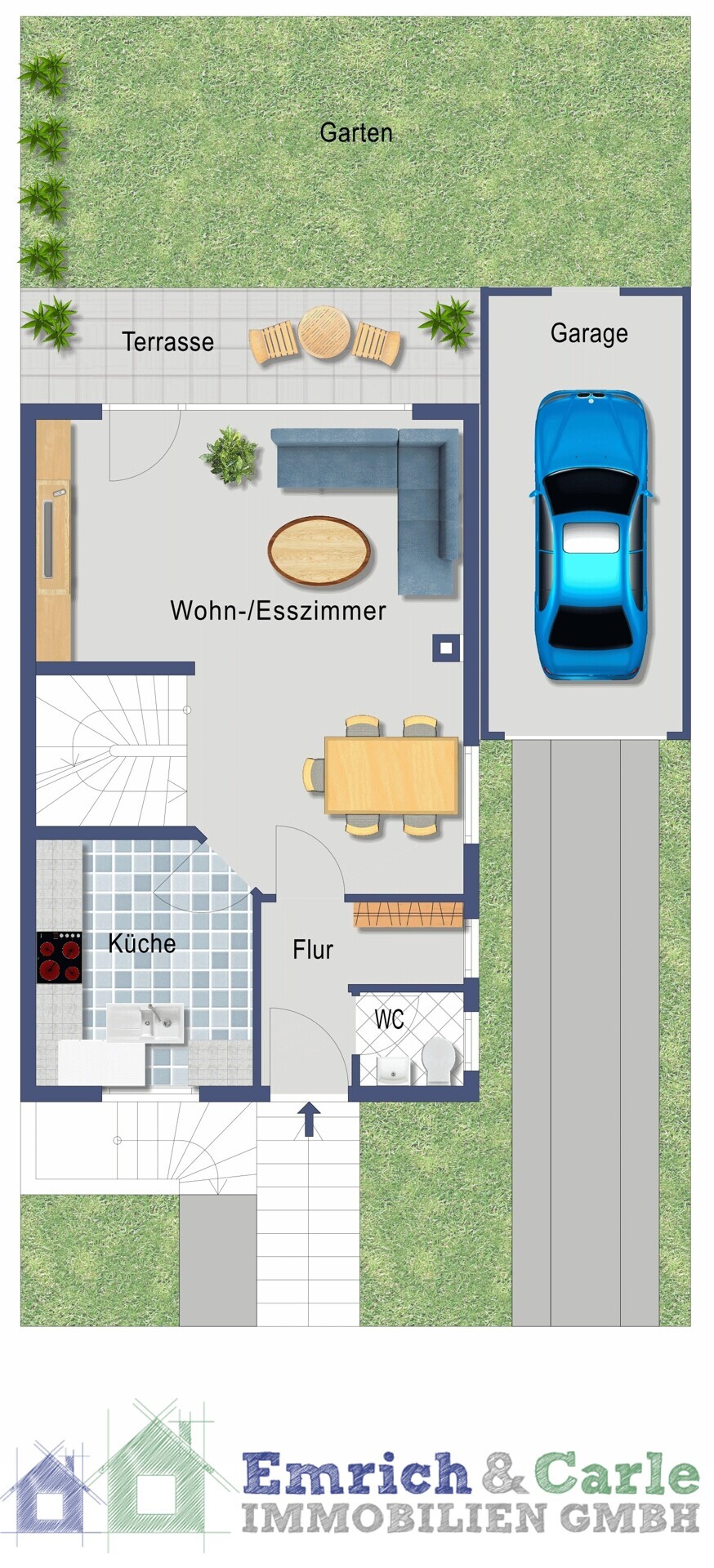 Der für Familien sehr gut gestaltete Grundriss bietet Ihnen im Erdgeschoss neben dem großzügigen Wohn-/Esszimmer außerdem eine Küche sowie ein für diesen Haustyp typisches Gäste-WC nebst Garderobe gleich im Eingangsbereich. Über die mit einer Markise ausgestattete und ca. 18 m² große Terrasse gelangen Sie in den gepflegten Garten. Von dort lässt sich auch die mit ca. 7 Metern überlange Garage begehen, sodass Sie auch ohne das Haus zu durchqueren in den Garten gelangen können.