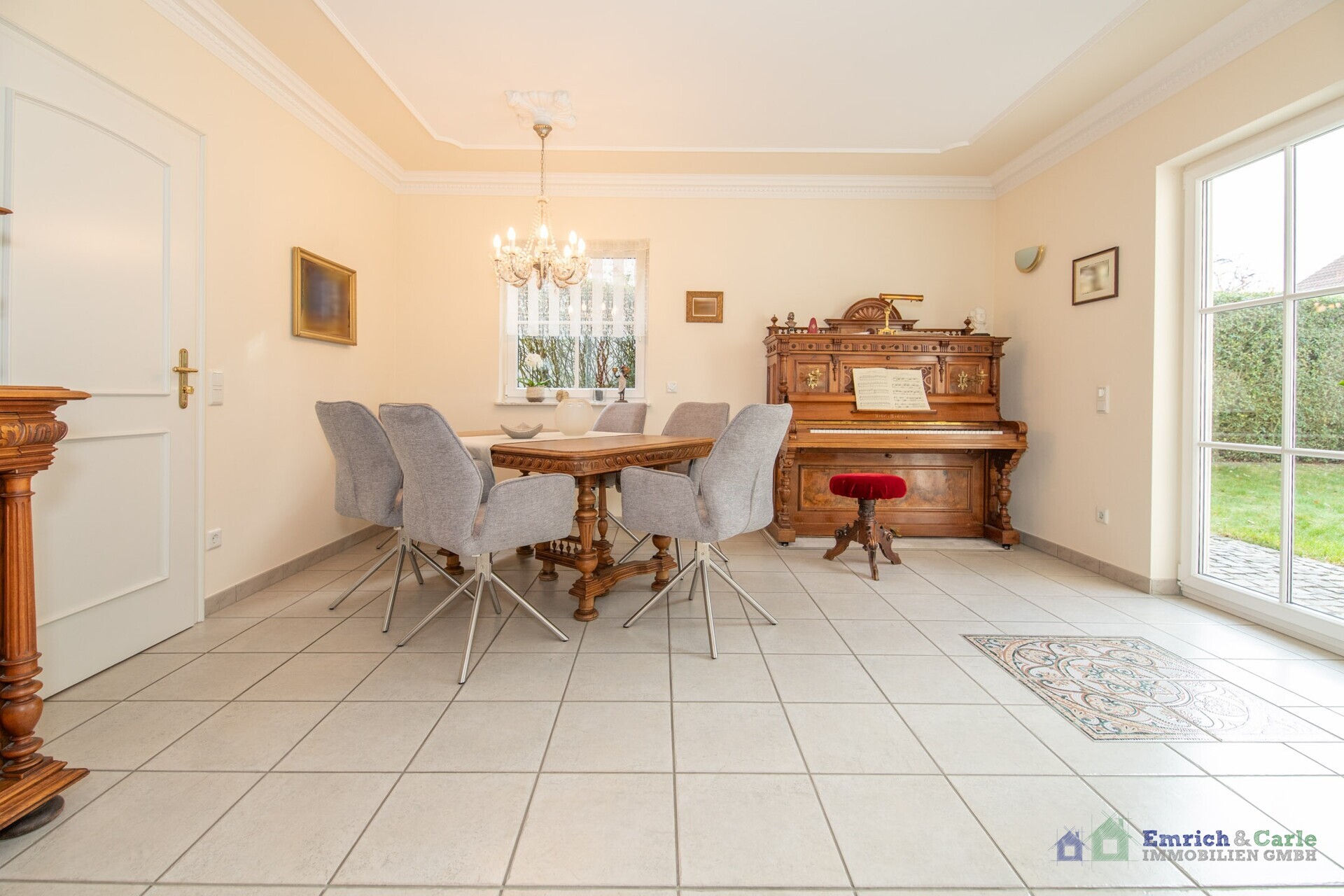 Der Eingangsbereich mitsamt fließendem Übergang zum großen Flur öffnet den Raum und schafft eine harmonische Verbindung zu den angrenzenden Räumen. Gleich zu Ihrer Linken gelangen Sie in die mit Speisekammer und erstklassigen Geräten sowie einer Granitplatte ausgestattete Küche; ein wahres Highlight! Sowohl für passionierte Köche als auch für alltägliche Familienmahlzeiten fehlt es Ihnen an nichts. Durch die direkte Verbindung zum Wohn-/Esszimmer wird der kulinarische Bereich geschickt in das Gesamtbild integriert. Der direkte Zugang zum Garten verstärkt den fließenden Übergang zwischen Innen- und Außenbereich.
