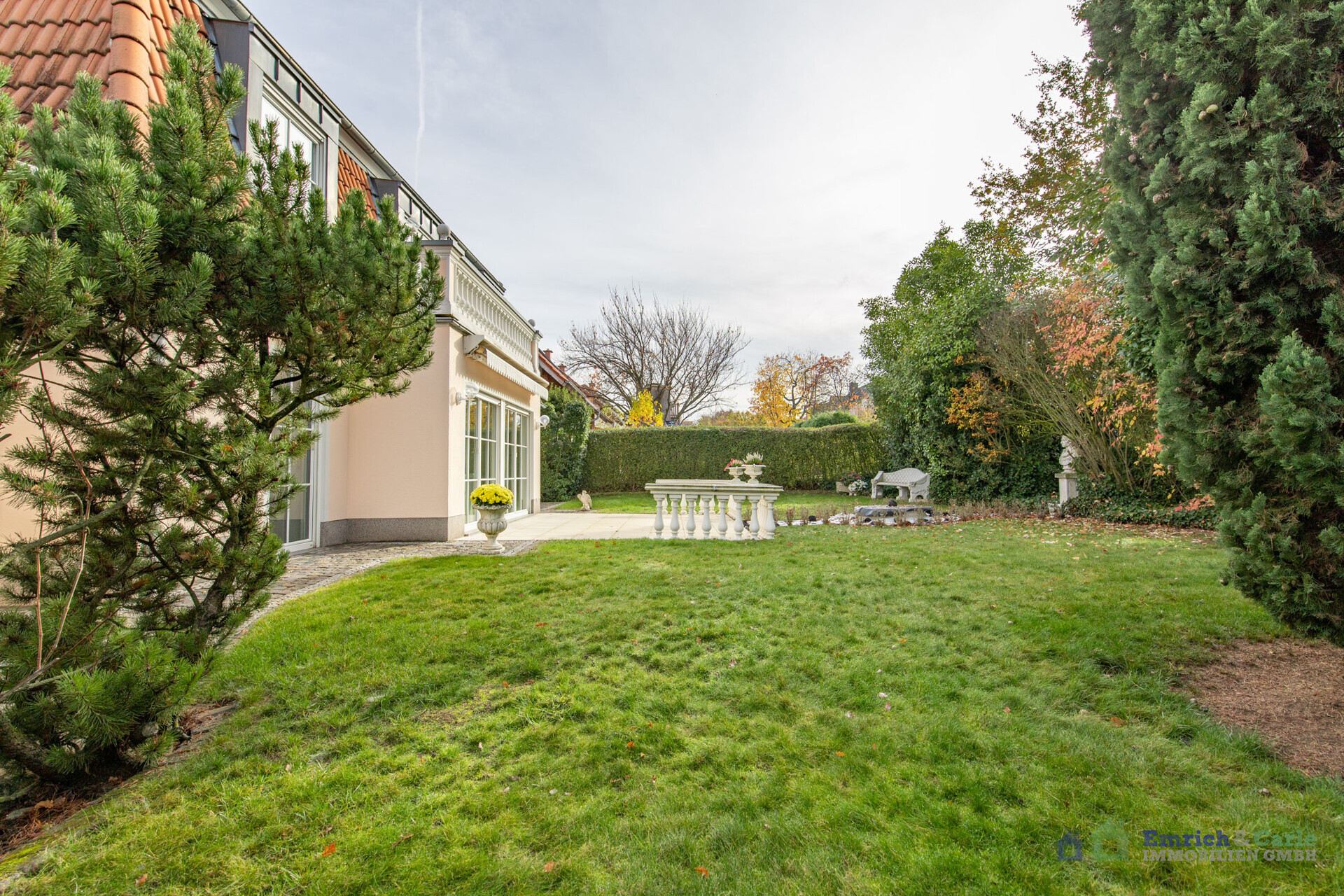 Der gut eingewachsene und in klassischen französischen und englischen Formen angelegte Garten rundet das Gesamtbild perfekt ab. Bäume und Sträucher sorgen nicht nur für viel Natur, sondern auch für ein hohes Maß an Privatsphäre und Ruhe. Die großzügige Grünfläche lädt zu Freizeitaktivitäten ein – ob zum Spielen für die Kinder, zum Entspannen in der Sonne oder einfach für gesellige Stunden im Freien. Der direkte Zugang zur Garage erleichtert die praktische Nutzung des Gartens und die einladende Terrasse ermöglicht eine komfortable Anbindung zwischen Haus und Garten. Der Vorgarten ist beidseitig vom Haus jeweils durch ein hochwertiges, klassisch verziertes Metalltor bzw. durch einen hohen Zaun vom Vorgarten abgetrennt und somit abgeschlossen.