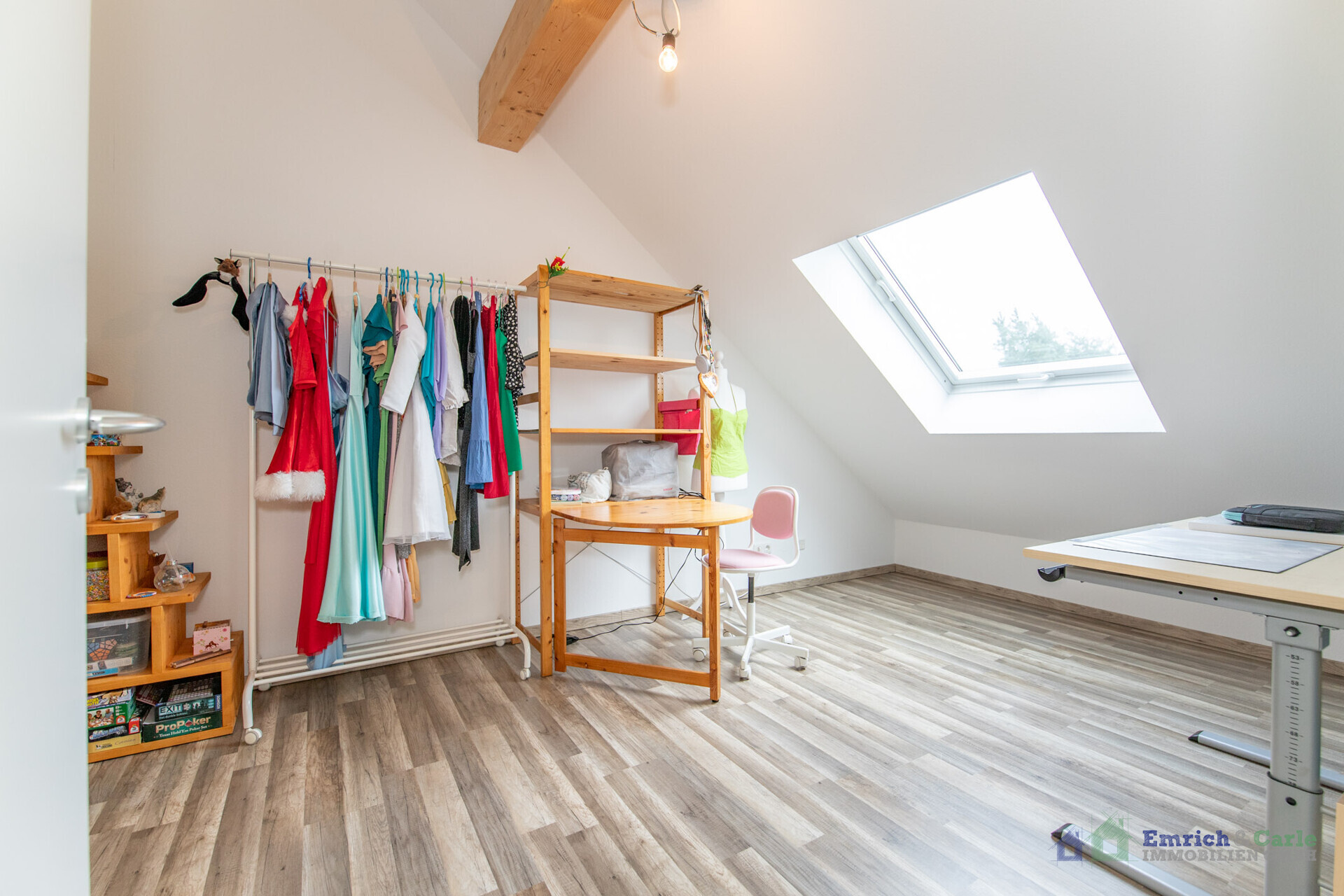 Das charmante Dachgeschoss bietet zusätzlichen Raum für flexible Wohnlösungen. Das größere der beiden Zimmer – aktuell als Teenagerzimmer genutzt – lässt sich unter anderem auch als komfortables Elternschlafzimmer mit Ankleide im daneben befindlichen Zimmer nutzen. Auch eine kreative Arbeits- und Hobbyfläche wäre hier oben perfekt darstellbar. Ein im Abstellraum integriertes WC mitsamt Waschtisch rundet das großartige Dachgeschoss sinnvoll ab.