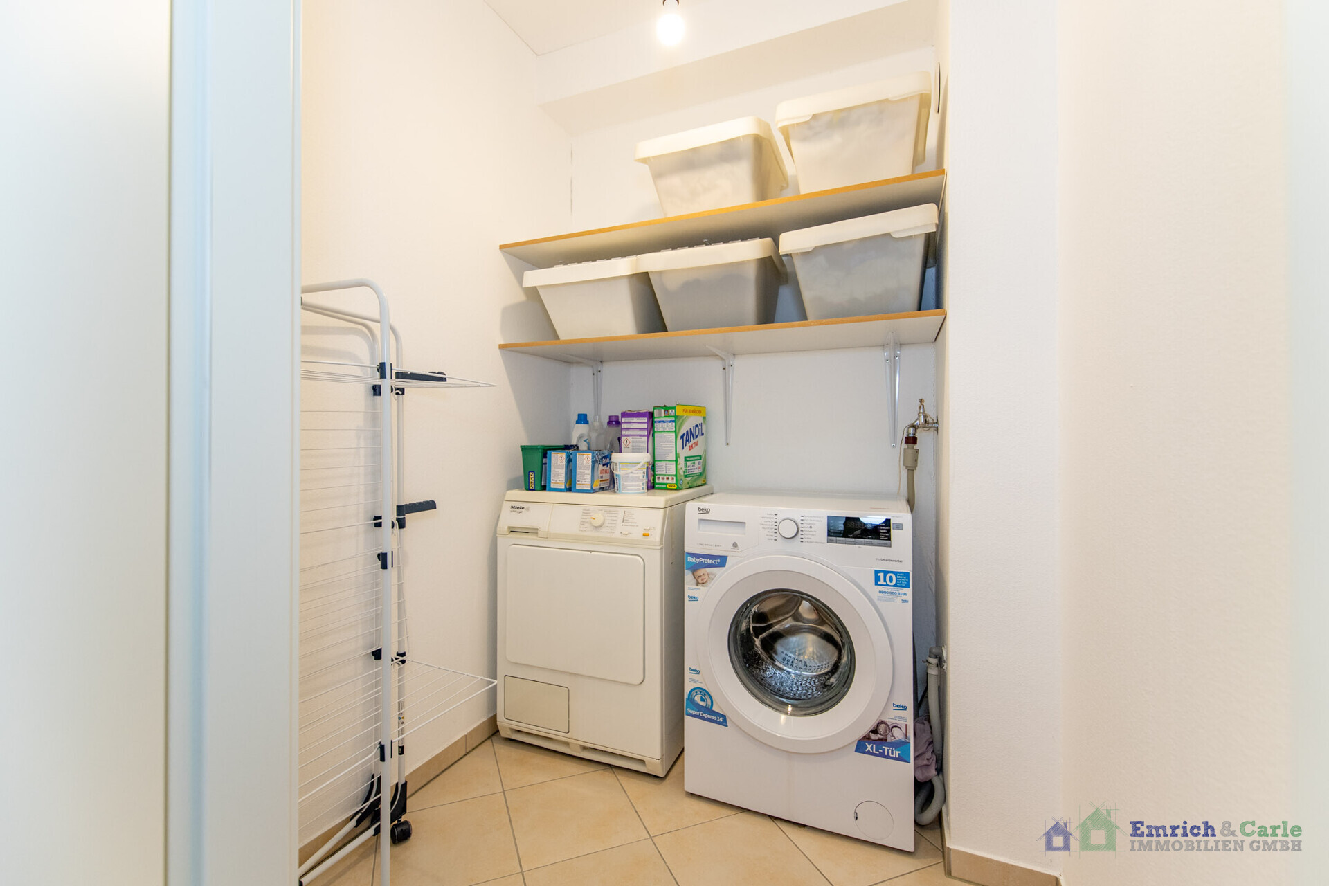 Ein modernes Badezimmer mit Tageslicht, Badewanne und separater Dusche sorgt für Komfort und Wohlbefinden. Ein vom Standard abweichender und dank der Größe enorm praktischer Abstellraum sorgt für den nötigen Stauraum, während der daran angrenzende Hauswirtschaftsraum für die gewisse Ordnung und Sauberkeit im Haushalt sorgt.