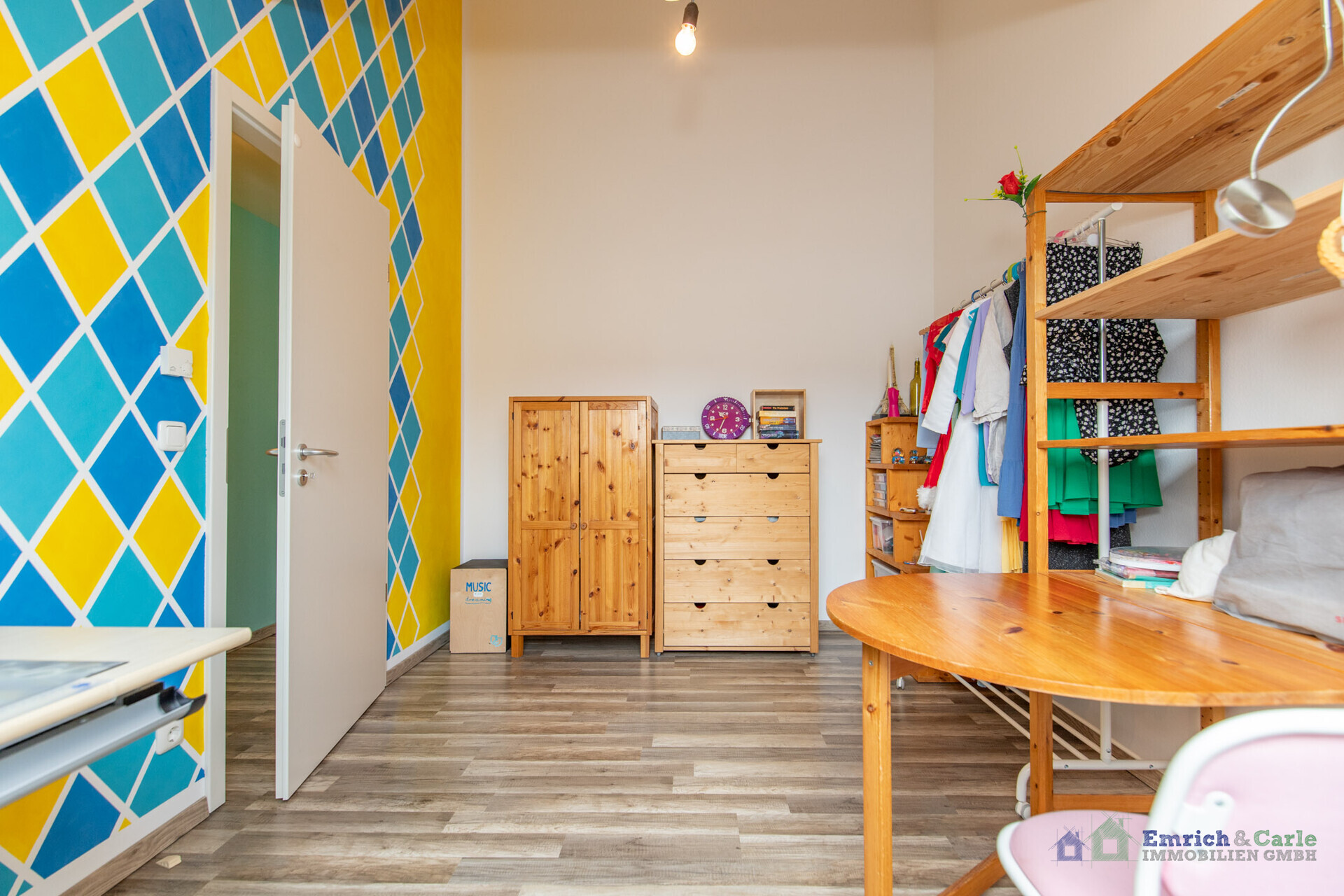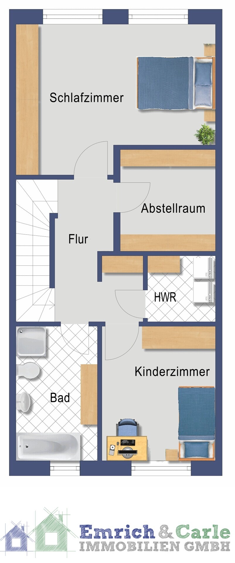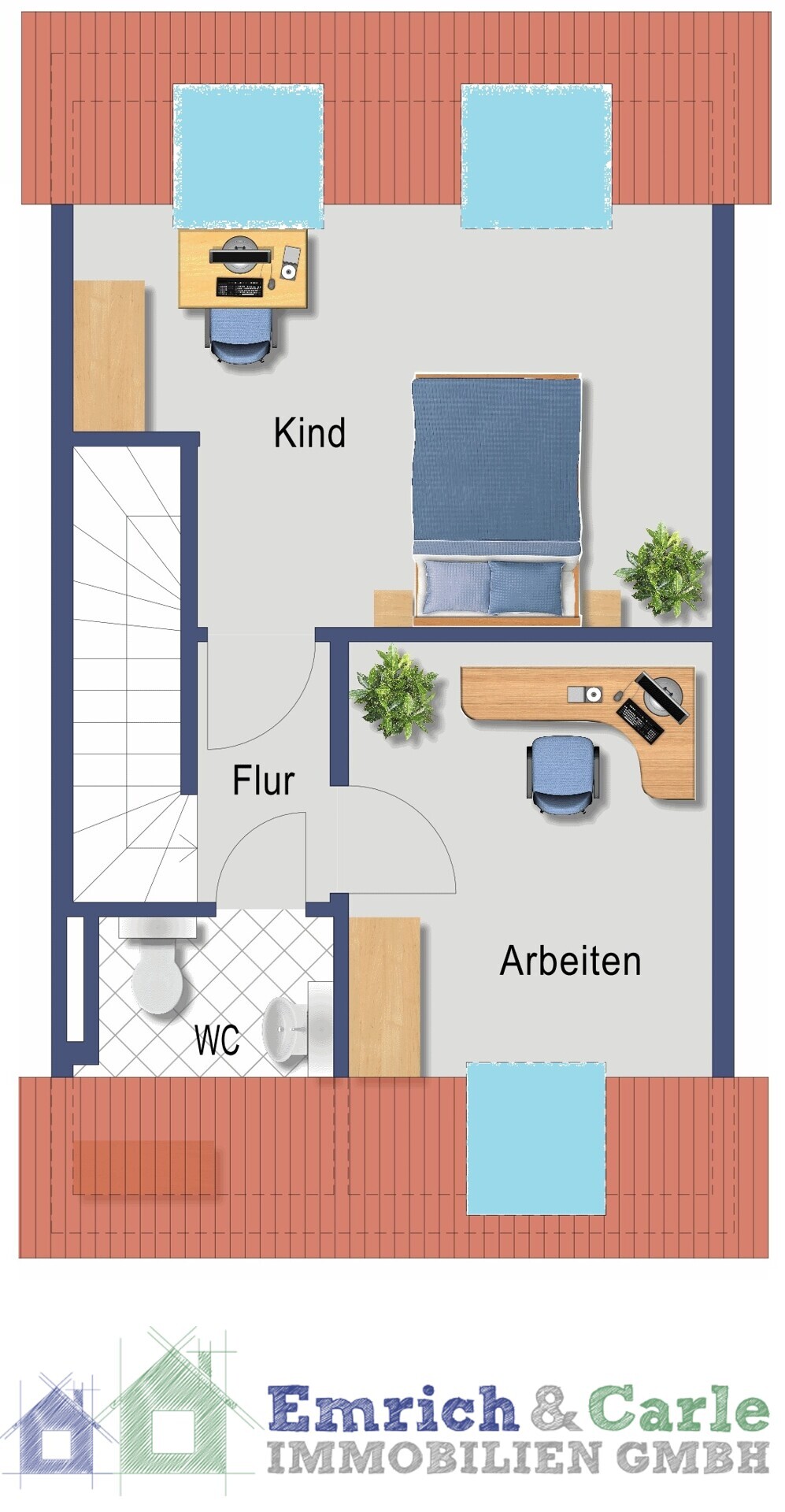 Über das offen gestaltete Treppenhaus erreichen Sie das mit individuellen Möglichkeiten ausgestattete Obergeschoss. In der derzeitigen Grundrissgestaltung befinden sich hier zwei Schlafzimmer, die sich dank zahlreicher nicht tragender Wände an nahezu alle familiären Bedürfnisse anpassen lassen. Das bislang sehr großzügig gestaltete Elternschlafzimmer lässt sich in zwei Zimmer verwandeln und der im Grundriss als Kinderzimmer bezeichnete Raum lässt sich hingegen vergrößern, falls Ihr individueller Bedarf es erfordert.